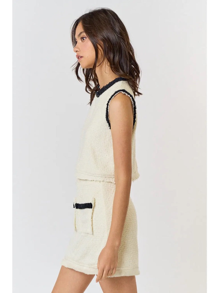 Elevate your wardrobe with our Soho Tweed Set. This luxurious Boucle Tweed Contrast Top and Mini Skirt Set exudes sophistication and exclusivity. The textured fabric and contrast detailing add an elegant touch to this timeless set. Create a chic and polished look effortlessly.