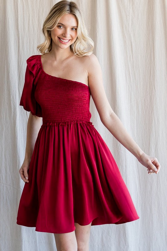 Solid satin baby doll dress with a one-shoulder neckline featuring a short puff sleeve and a smocked bodice. Thicker material and unlined.